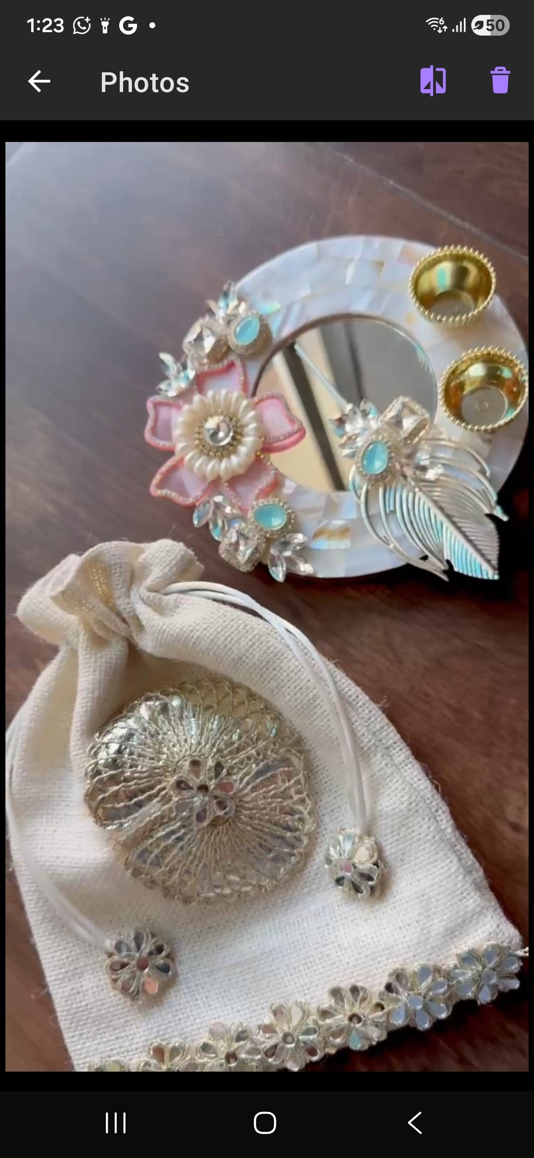 Beautiful mother of pearl tilak platter with stick packed in a jute potli which is reusable perfect to gift your loved ones